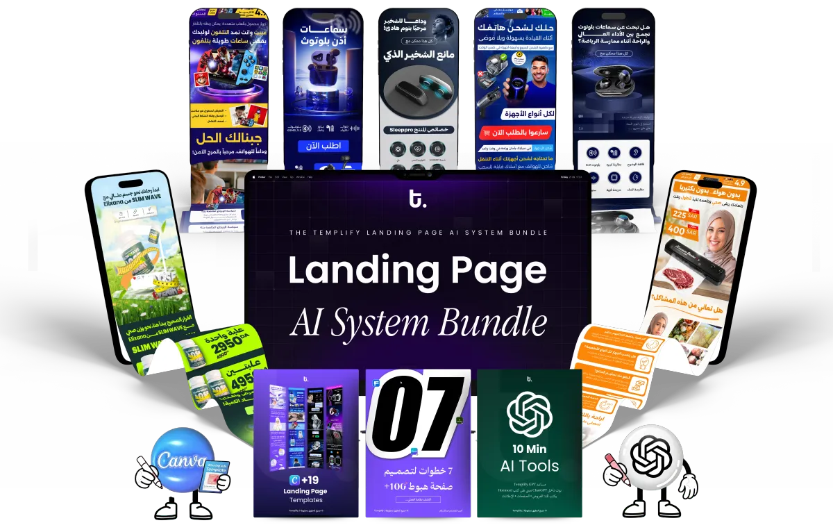 الدليل الكامل + 19 قالب صفحة هبوط + 20 Hook جاهز + أوامر AI + مساعد Templify GPT + سنة Canva PRO… وكل شيء تحتاجه لبناء صفحة تبيع.